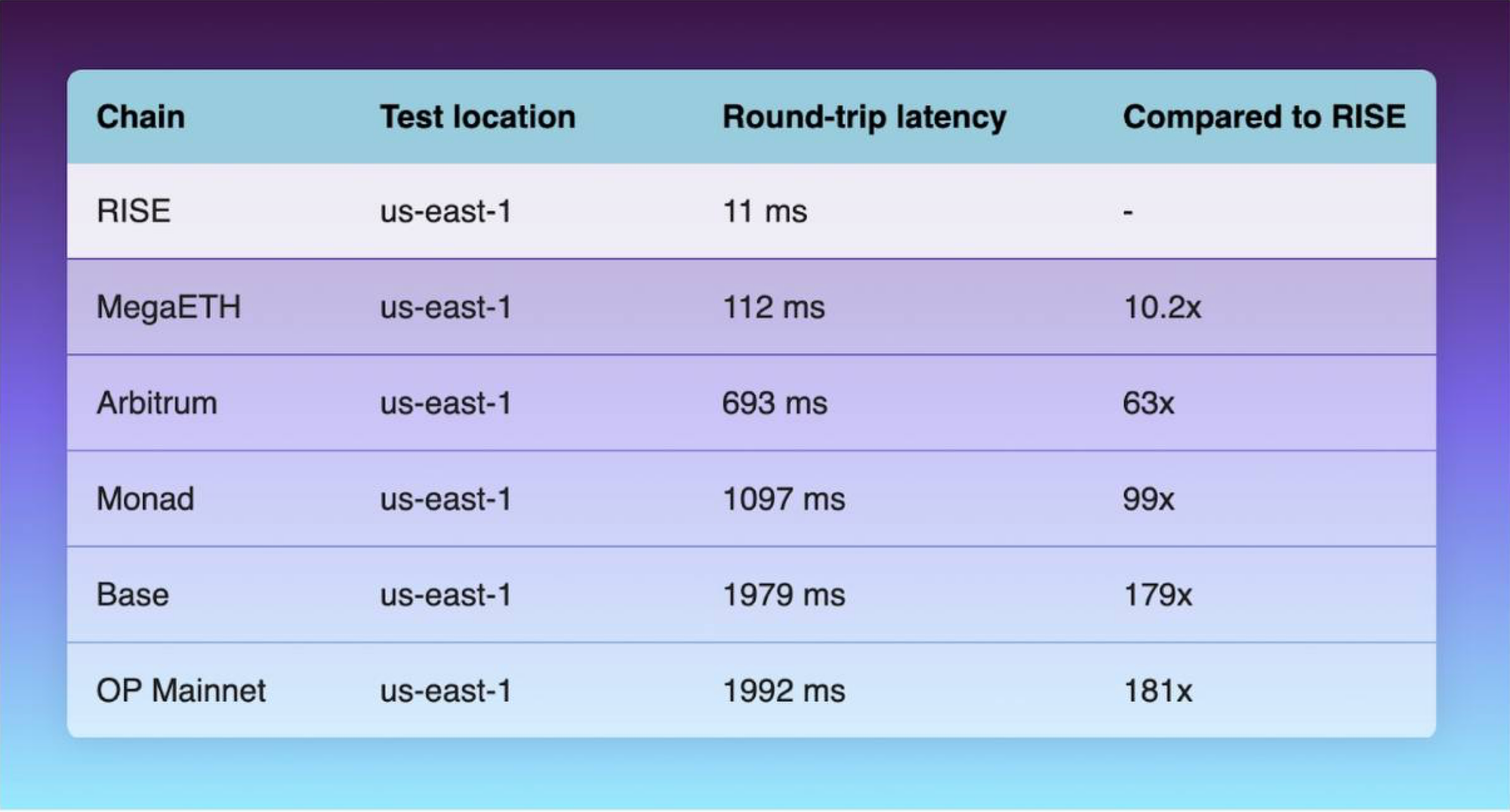 | RISE | MegaETH | Base (flashblocks) | Arbitrum | |