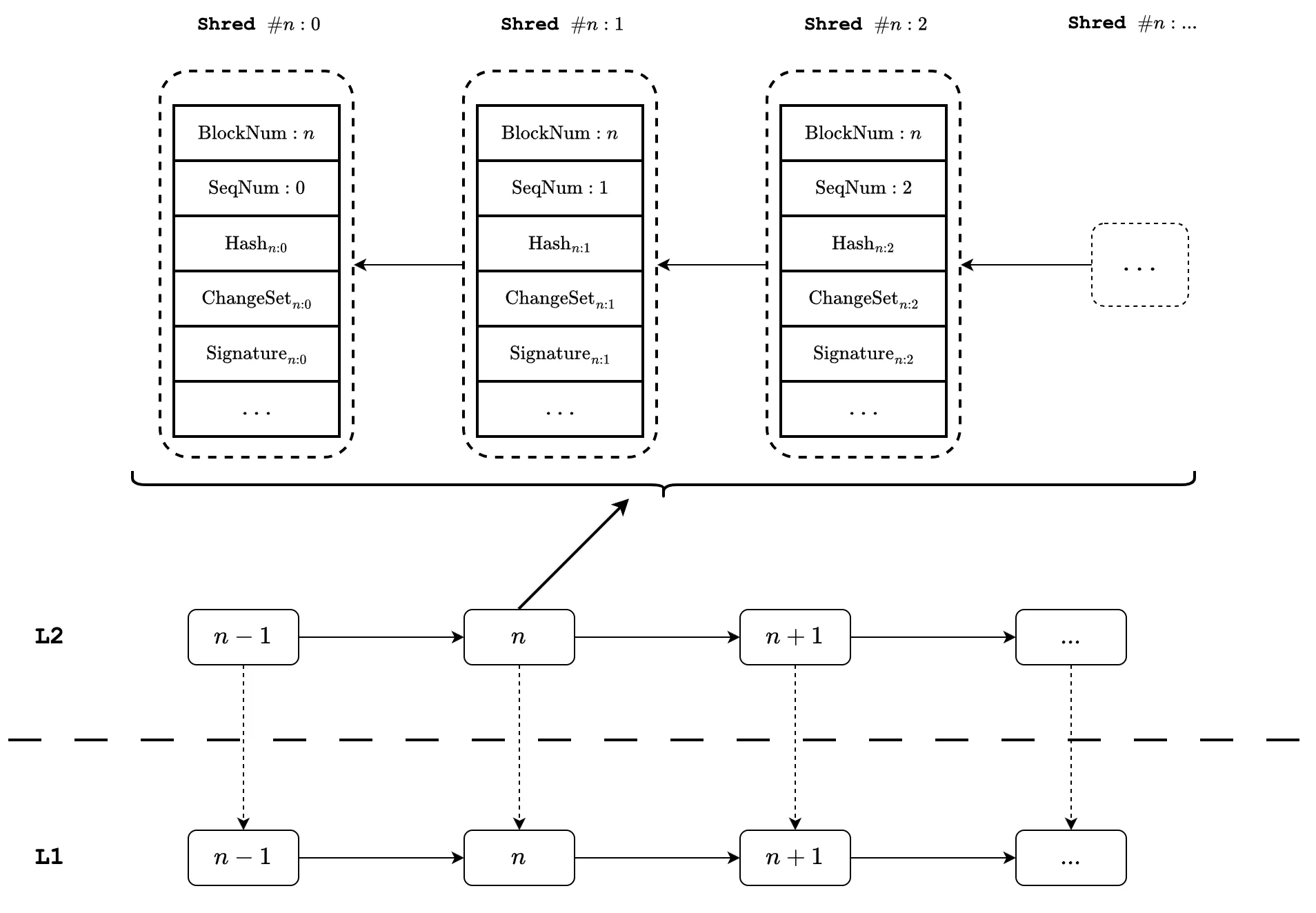 \(\mathtt{Shreds}\) partition an L2 block into multiple consecutive, connecting segments. Each \(\mathtt{Shred}\) for an L2 block is identified via its sequencer number. In other words, block_num and seq_num together can always identify a \(\mathtt{Shred}\). The sequence number is increasing for each \(\mathtt{Shred}\) and is reset when a new L2 block is constructed.