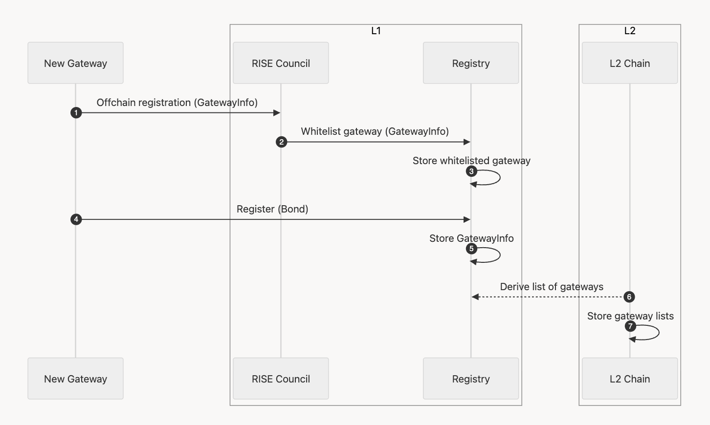 At this phase, gateway registration is done in a centralized manner in which interested parties register to a RISE Council (managed by RISE) and RISE Council will manually whitelist gateways to the Registry contract living on the L1. The Registry contract implements the widely-adopted IRegistry interface to make sure it is extensible and compatible when we transition to the final phase.