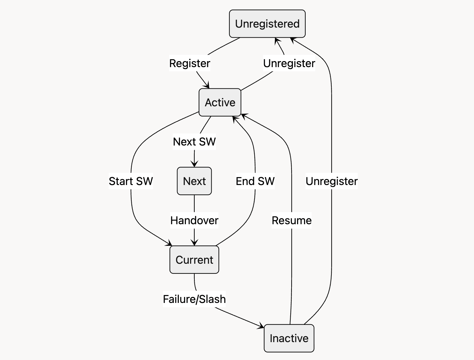 The lifecycle of a gateway starts with an entity registering to the Registry contract to become a gateway. This changes the state of the gateway from Unregistered to Active. Note that it is the responsibility of the gateway to fully sync the L1 and L2 networks before registration. An Active gateway becomes the Current/Next gateway if its current/next sequencing window arrives (see below). During the handover period, in which the current sequencing window ends, the Next gateway becomes the Current gateway while the Current gateway switches back to Active. If the Current gateway is offline or slashed (due to misbehaviors), it becomes Inactive and can only be Active again after resuming its role on the Registry contract (which requires adding more bonds). Active and Inactive gateways can unregister anytime to exit the gateway schedule.
