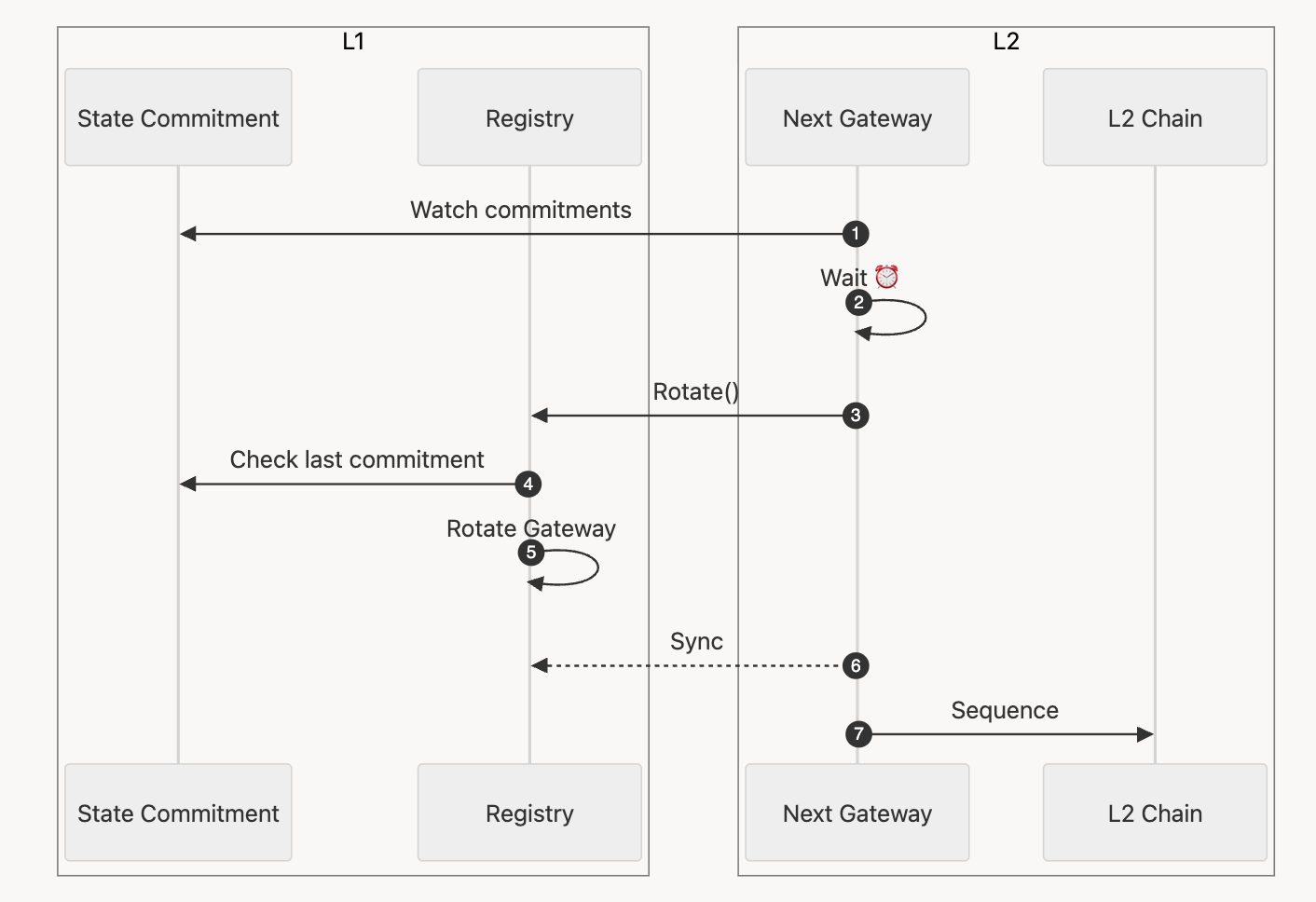 - Gateways register via a centralized Registry contract on L1, enabling deterministic on-chain discovery of the current and next sequencers.