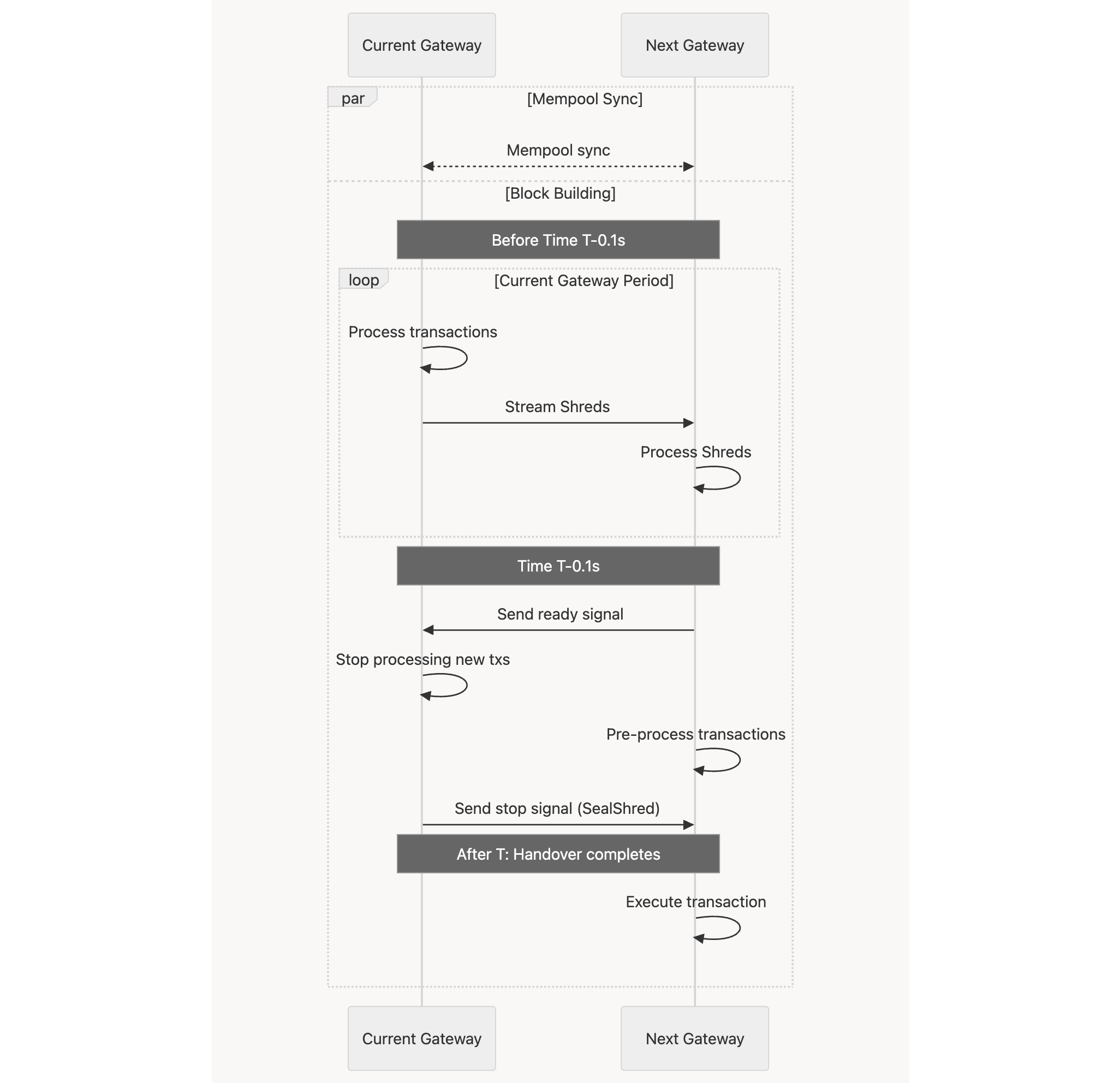 - Efficient handover is achieved through real-time \(\mathtt{Shred}\) streaming and direct mempool synchronization between the current and next gateways.