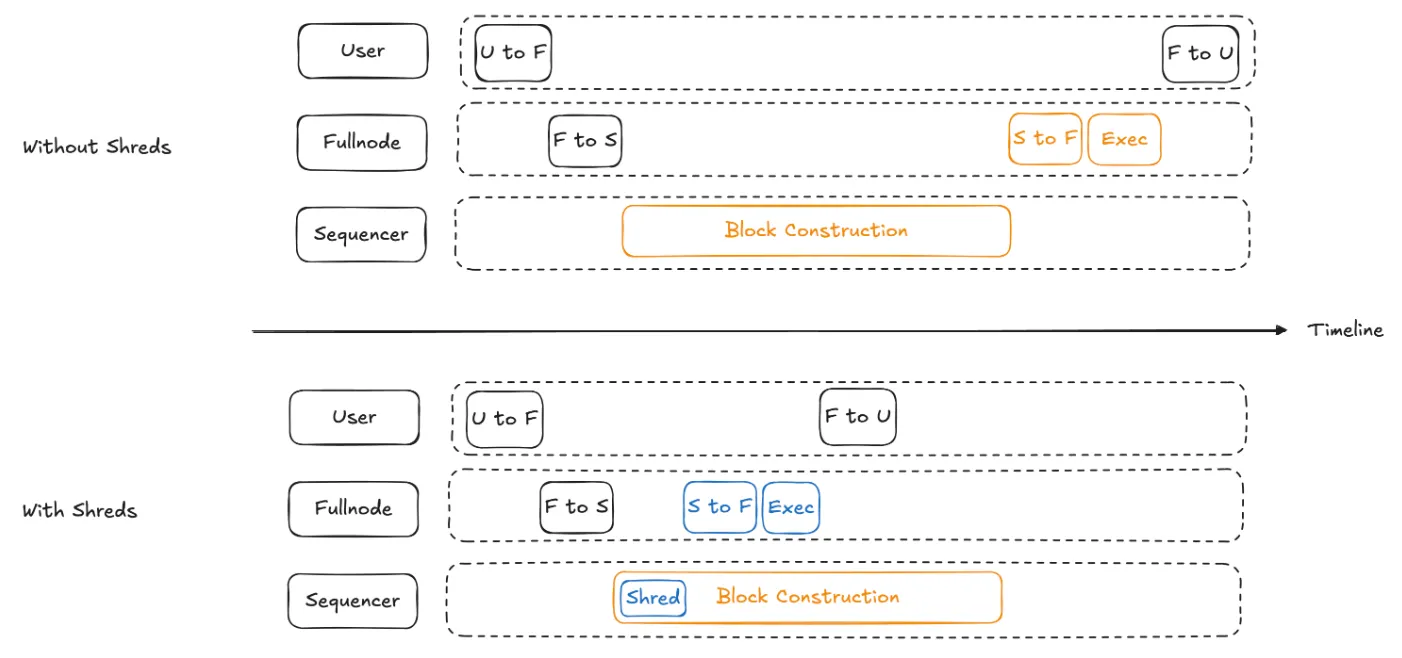 Block broadcasting is done per \(\mathtt{Shred}\) instead of waiting for the full L2 block, and a \(\mathtt{Shred}\) is just a few miliseconds long, allowing almost instant preconfirmations and fast state updates.